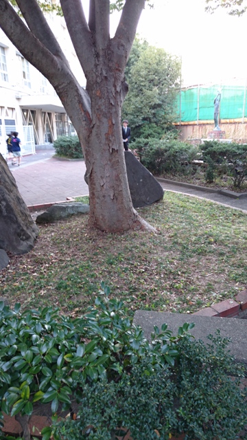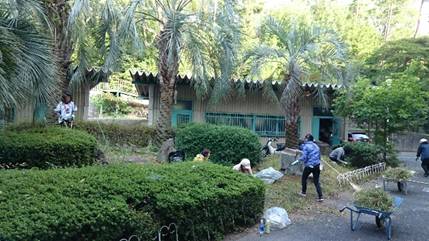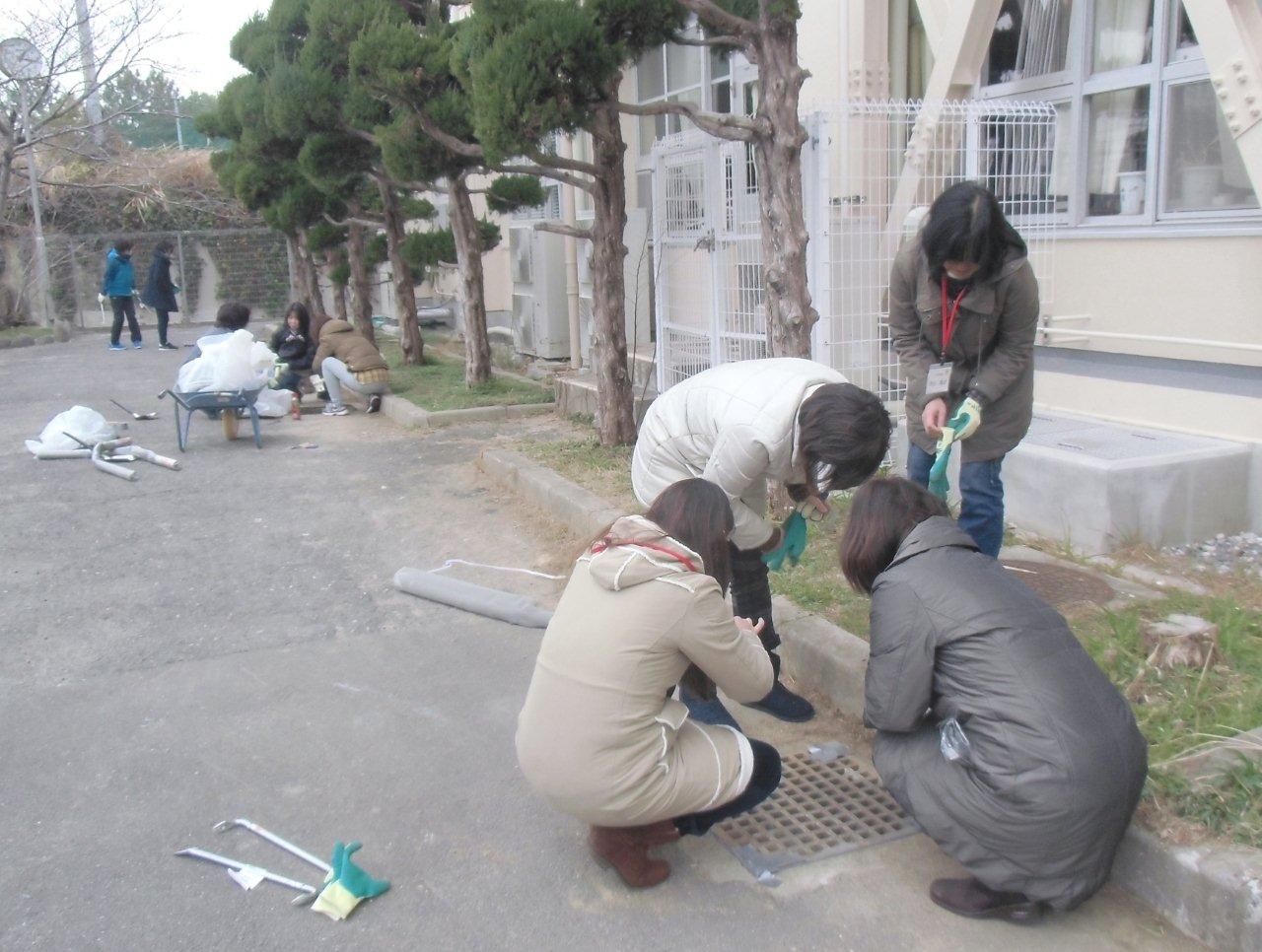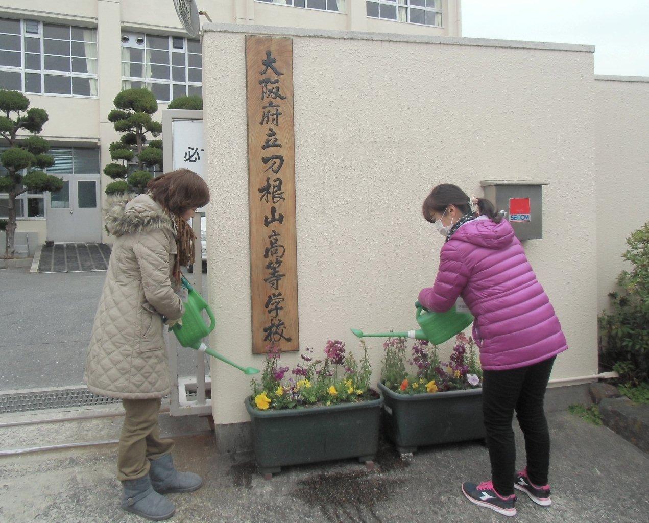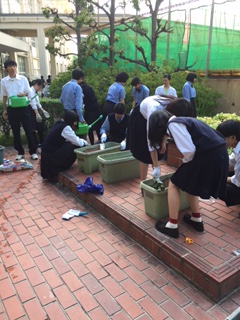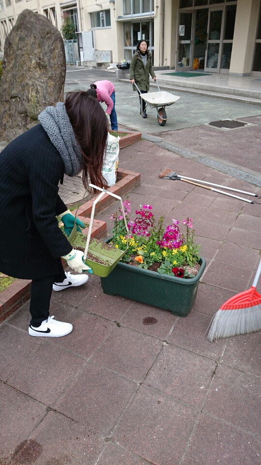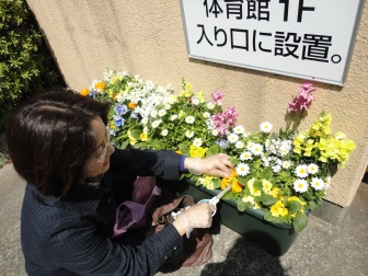 入学式前に校門前で花殻取り中の