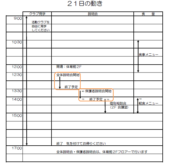 (1)全体説明会(オープニング・あいさつ・学校紹介 の予定) (2)保護者説明会(30分 の予定) (3)自由に校内、部活動見学 詳しくは, 部活動は, 活動場所は, (4)食堂は、10時半から営業します。 メニューは, 売切れた場合は、ご容赦ください。 |