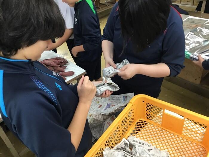 クリーンキャンペーン前日の、生活スキルの授業で濡らした新聞紙を芋に巻いてアルミホイルにくるむ作業をしました。
