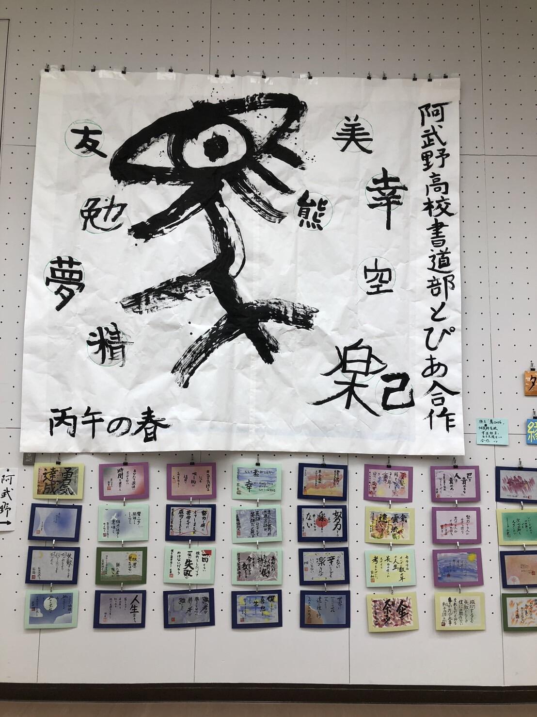 1月20日(火)~1月25日(日)まで開催されている、大阪府高等学校書道展に書道部との共同作品が出品されています。書道部の生徒が書いた今年の干支の「馬」の字を中心にして、周りはぴあ生が今年の目標とすることを漢字一文字にしたためて書きました。