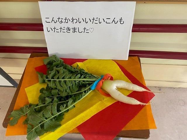前回のブログでは、小学部のみんなが育てた大根を給食室に届けてくれた様子をご紹介しました。今日は、その大根がついに給食のメニューに登場しました! 本日の献立はご飯、豚肉の甘辛煮、ふろふき大根、芋の子汁、牛乳 です。 ふろふき大根には、あの小学部のみんなが心を込めて育ててくれた大根を使用しています。そして芋の子汁には、大根の葉っぱも入っています。朝、調理員さんが包丁で切ったとき、「きれいで柔らかそ...