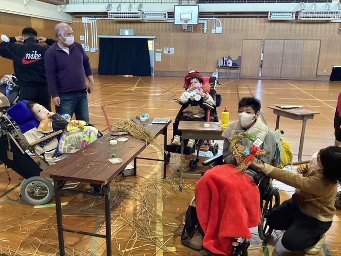今日は高等部A班のしめ縄づくりの様子を見学しました。 近づくと、山積みにされた藁のにおいが広がり、思わず「お正月が近づいてきたな」と感じます。子どもたちが 実際に触ってみると、藁は思った以上にしっかりしていて、曲げるのがなかなか大変! 子どもたちと教員は力を合わせて、しっかりとねじりながら形を整えていきました。完成したしめ縄は、どれも個性があって素敵でした。 本日は訪問学級の生徒2名も無事に参加...