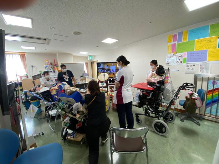 今回は、和らぎの訪問教室の子どもたちの授業の様子をご紹介します。 音楽の時間には、夏の校内音楽会で先生たちが披露した演奏に合わせて、子どもたちも太鼓で参加しました。 先生たちの演奏にリズムを合わせながら、握ったり、ひっぱったり、スィッチを操作しながら元気いっぱいに太鼓でリズムを取りました。看護実習の学生さんたちも加わり、教室中が楽しい雰囲気に包まれました。