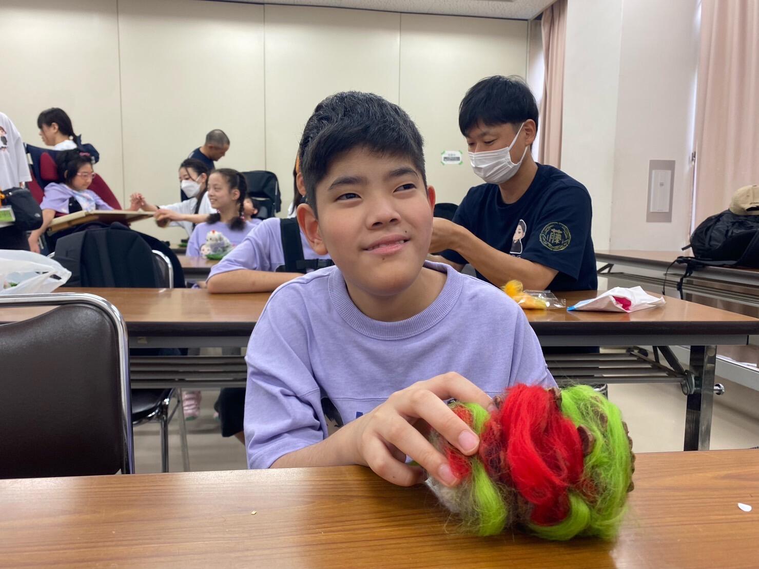 大きめの松ぼっくりをカラダに見立てて、自分で選んだ色の綿毛を巻き付けて、最後は目と鼻と耳をくっ付けて完成!