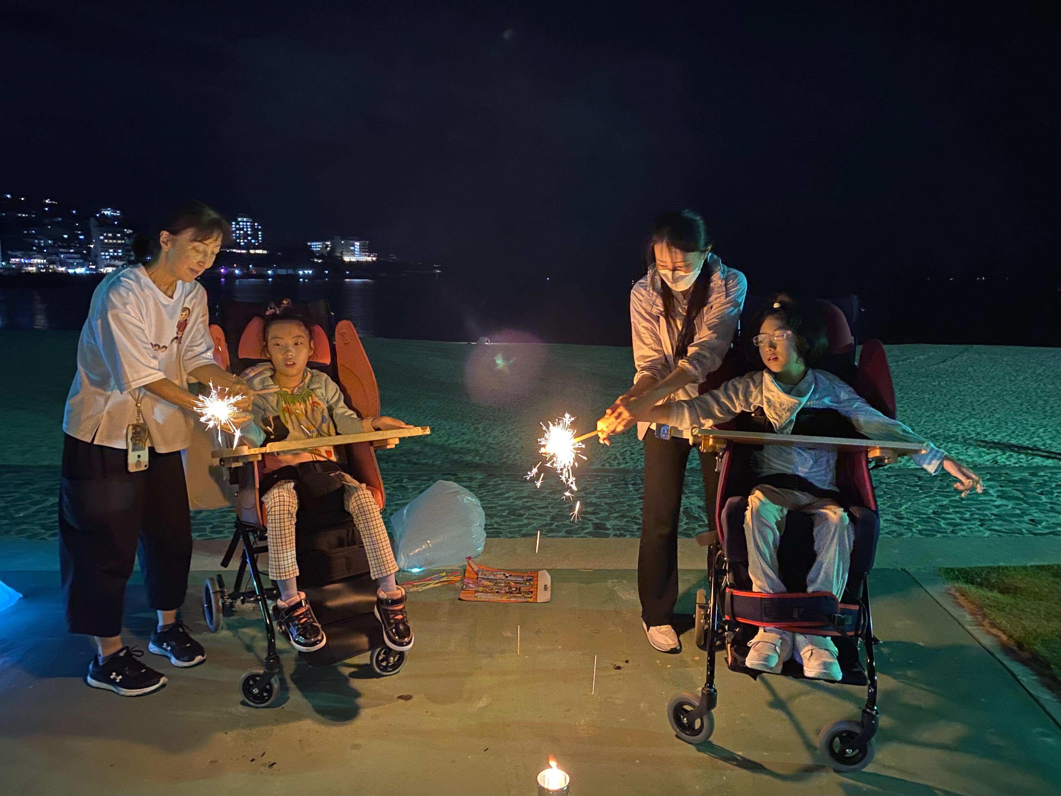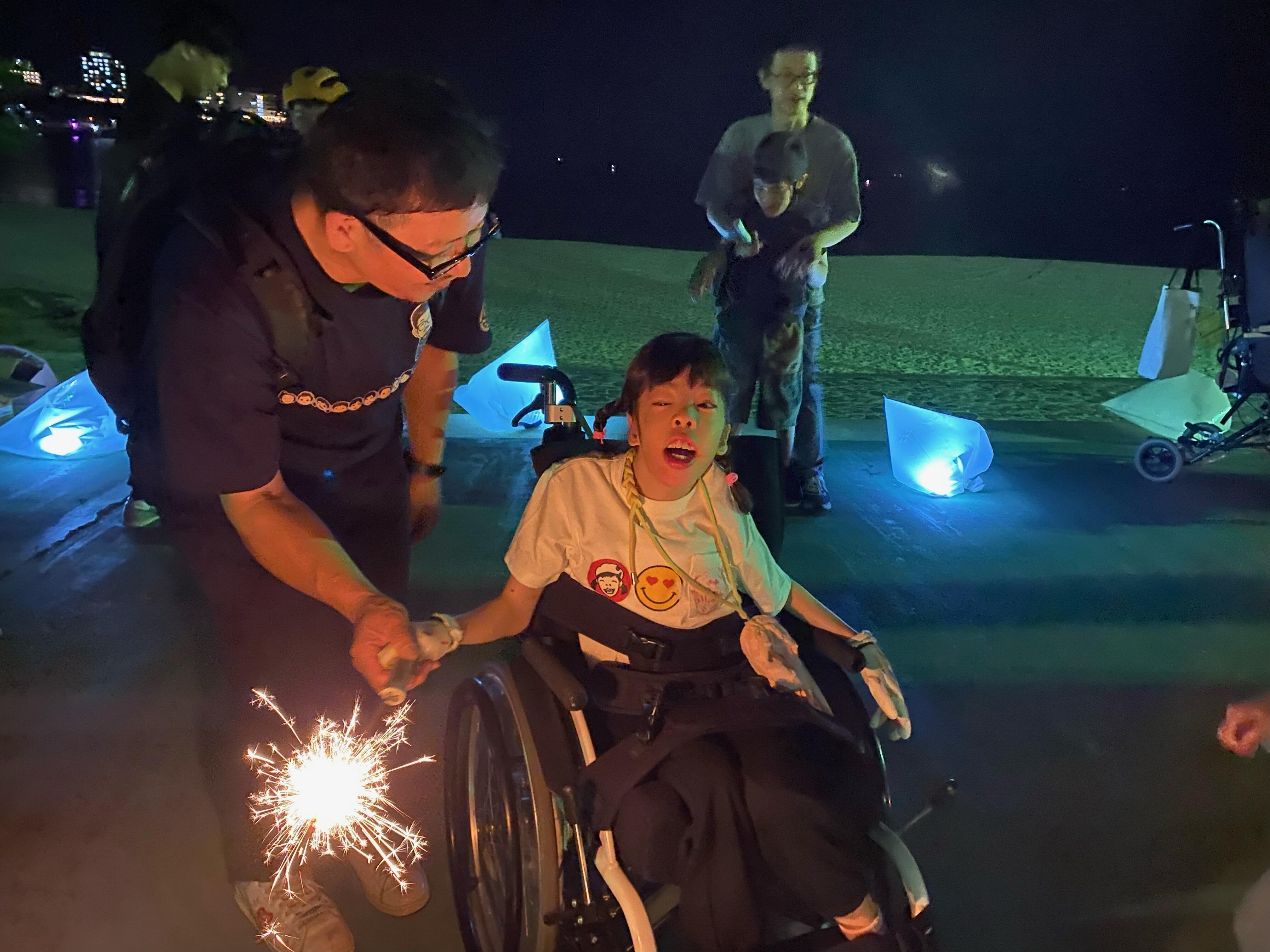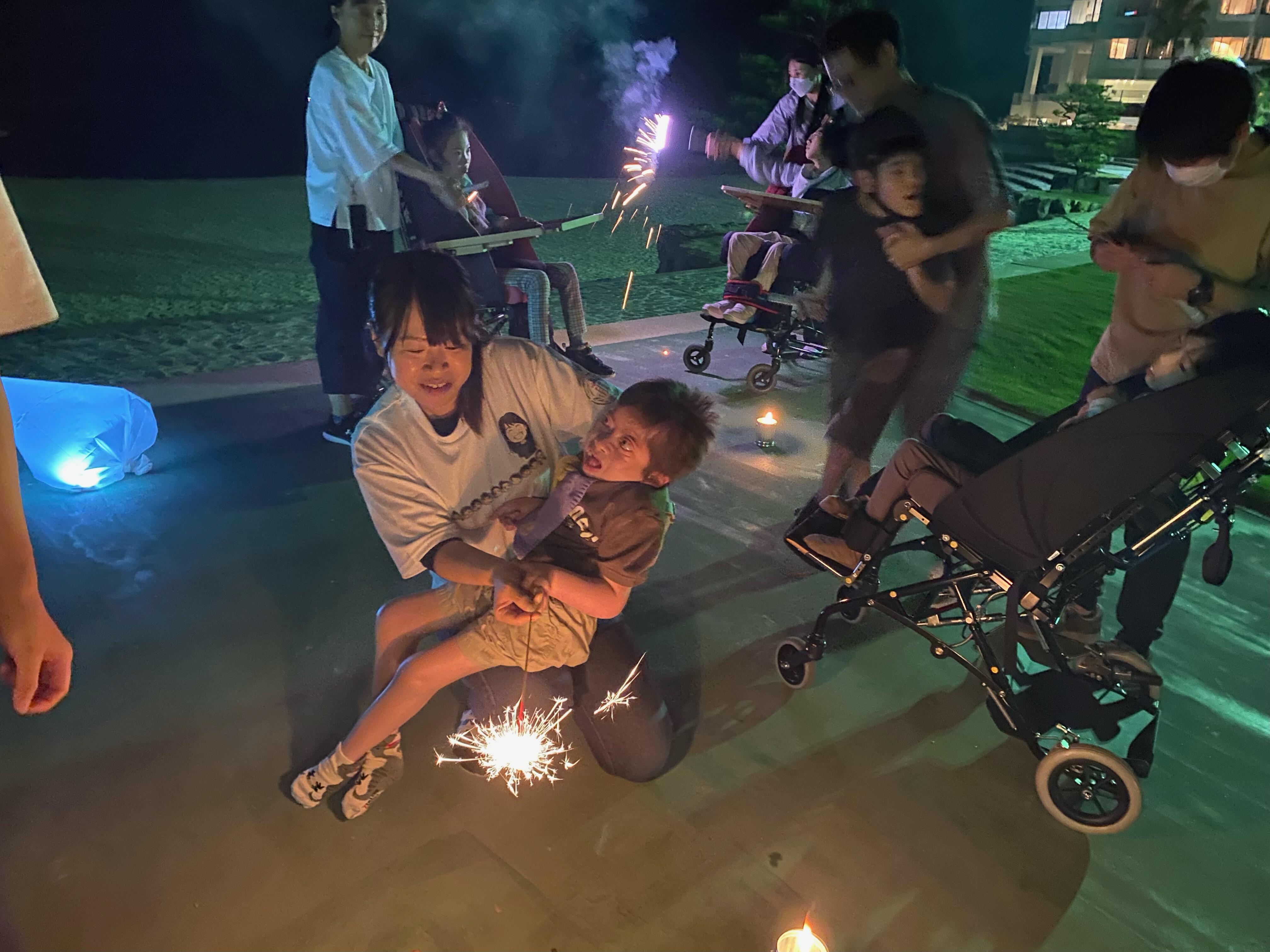手持ち花火を持ちながら、声を出して楽しむ子、不思議そうな面持ちの子、暗闇に飛び散る花火をじっと見つめる子、みんな思い思いに花火を楽しんでいました。