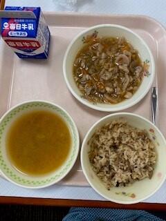 今日の給食は「秋の味覚」がいっぱいでした。まずは 舞茸ご飯。お肉のうまみと舞茸の甘みがご飯にしみこんで、とってもおいしかったです。かぼちゃとみょうがのみそ汁は、かぼちゃのやさしいとろみに、みょうがのシャキシャキ感がよいアクセントになっていました。れんこんの炒め煮は、やさしい味つけでホッとするおいしさ。れんこんの食感も楽しめました。まさに「秋づくし」の給食! 心も体もあたたまるメニューでした 🍂✨