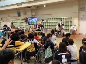 はじめに、栄養教諭から「マーボー茄子」の紹介がありました。作り方のビデオを見たあと、実際に3人の児童生徒が前に出て、調理の手順を楽しく実演してくれました。みんな興味津々で見入っていました。