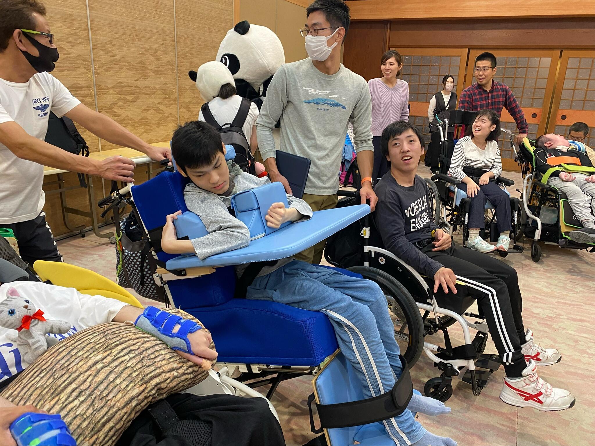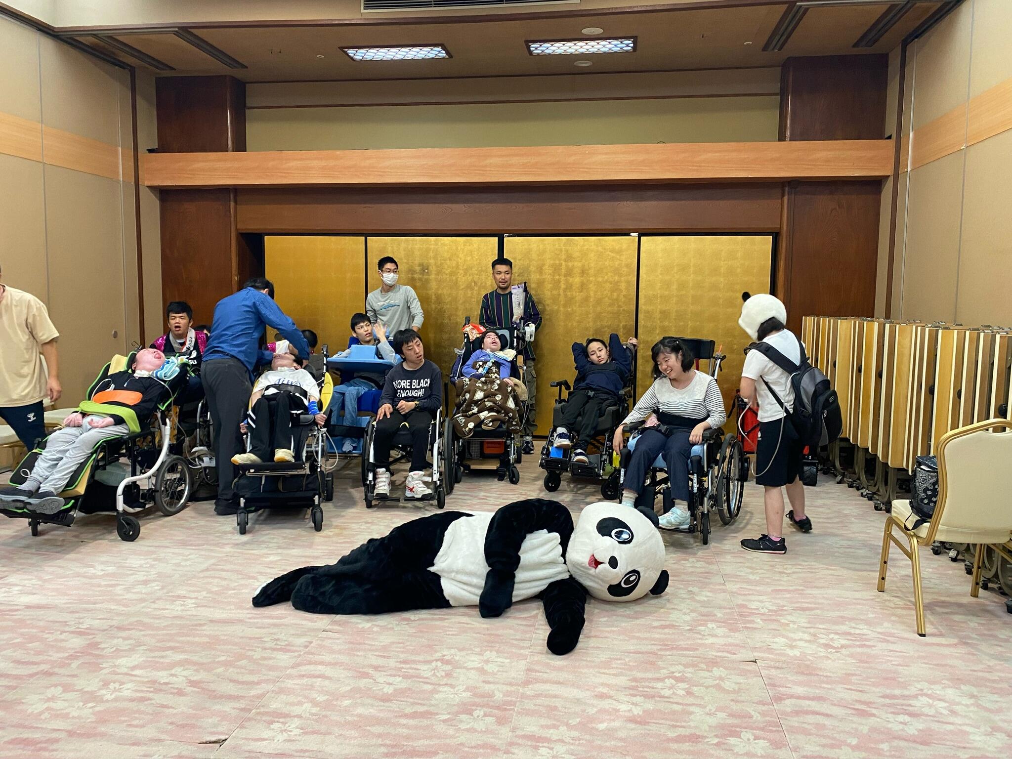 大きなパンダの出現で、生徒も先生も大盛り上がり!