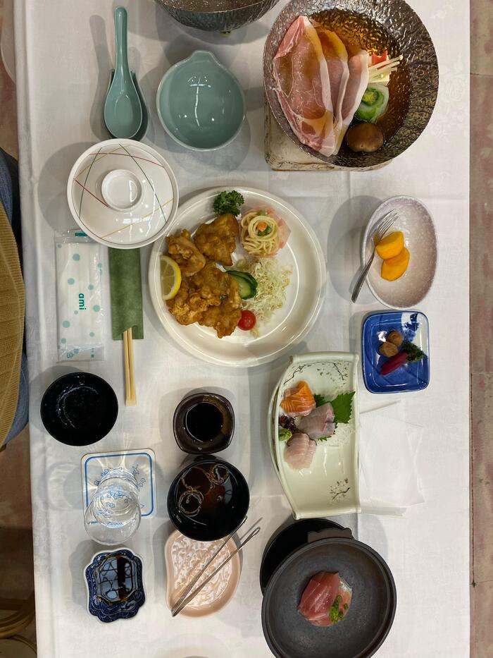 2泊3日の修学旅行、2日目の夕食の時間です。 ホテルむさしでの最後の夕食のメニューは、鶏の唐揚げ、お造り、豚肉の小鍋、鮪のステーキ、デザートと栄養もボリュームも満点! アドベンチャーワールドを楽しんだし、白浜の湯にも浸かったし、あとは腹ペコの44期生。 いただきますの挨拶に合わせてスタート。 女子生徒はみんなかわいい浴衣姿で先生とワイワイお話ししながら、お箸を進めていました。 男子生徒はガッツリ食...