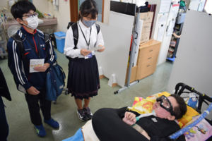 10月31日、和らぎ苑の中学部と藤陽中学校との交流でした。それに先立つ10月27日、藤陽中学校の生徒会役員2名が和らぎ苑の教室まで合唱コンクールの招待状を直接持ってきてくださいました。訪問学級からは中学校のコンクール会場入り口に飾る作品を渡しました。交流当日、地域の幼稚園、小学校の発表、3年生合唱、教員合唱を鑑賞しました。一緒に口ずさむ場面もありました。退場時にはアナウンスで紹介してもらい、大きな拍手の中を前期生徒会役員5名にエスコートしてもらい退場しました。「私も一緒に和らぎ苑に行けばよかった。」と感想を述べてくれた役員も。さらに来年1月、富田林市すばるホールで開催される「なかよし作品展」に藤陽中の作品とコラボ展示する予定です。