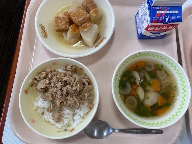 ご飯、豚肉の甘辛煮、ふろふき大根、芋の子汁、牛乳 です。