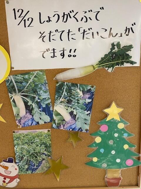 前回のブログでは、小学部のみんなが育てた大根を給食室に届けてくれた様子をご紹介しました。今日は、その大根がついに給食のメニューに登場しました!