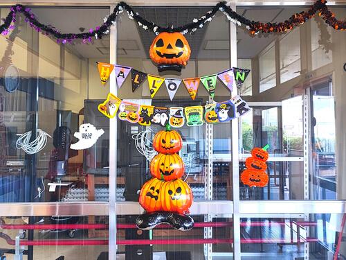 小学部玄関はフォトスポットになるようにしてみました!子どもたちが先生と一緒に写真を撮って楽しんでいる姿を思い浮かべながら楽しく飾り付けました。ハロウィンの季節ならではのワクワクを味わってもらえると嬉しいです。