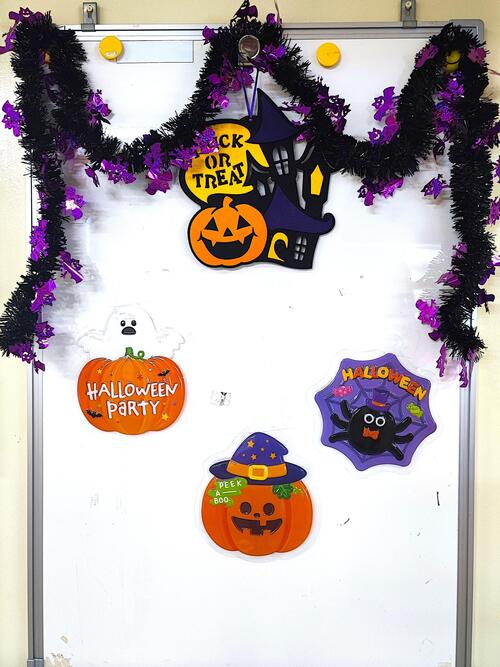 小学部玄関と保護者控室横のホワイトボードを、ハロウィン仕様に飾りつけしました!