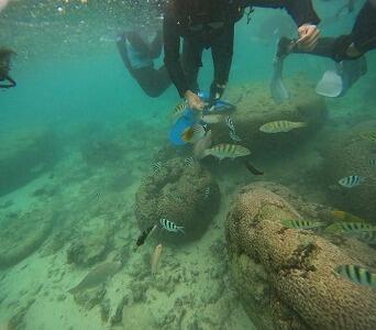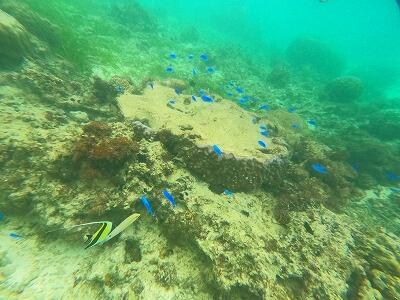 青の洞窟は雨のため波が高く行くことを断念しました。魚が多いポイントでシュノーケルと、魚への餌やりを体験しました!