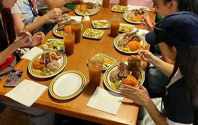 18時半から、ホテル向かいのジャマイカングリルで夕食。マンゴージュースで乾杯の歓声と共に食事が始まりました。なかなかの量でしたが、みんなしっかりと食べていました。