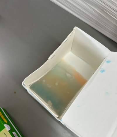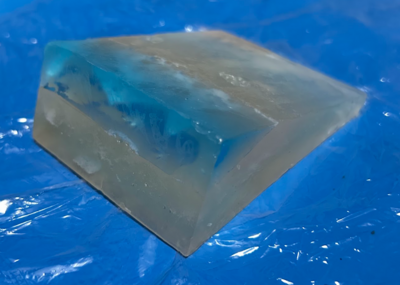 グリセリンセッケンを着色用セッケンと溶かし、加工した牛乳パックの型に流し込み、冷やして完成です。