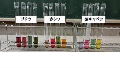ブドウジュース、赤シソの出汁、紫キャベツの出汁のそれぞれに、酸性のレモン汁、中性の液体ソープ、アルカリ性の水酸化ナトリウムを入れ、色の違いを観察しました。