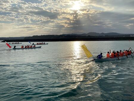 伊江島を後にし、本部港から古宇利島へ。ハ-リ-競争を行ないました。 港での開会式 安全に実施できるように諸注意を真剣にききます Ready go! 全部で10レ-ス行われました。先生チ-ムも参加しておおもりあがりでした。1位になったのは2組です。発表の瞬間は飛びあがり喜んでいました。賞品もゲット。クラスの団結がより強まったことでしょう。