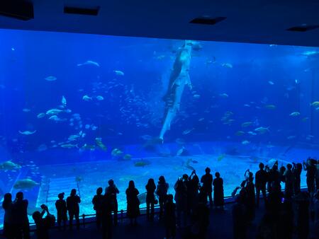 修学旅行3日目 今日は マリン体験と美ら海水族館への観光へ、2班に分かれての行程です。まずは1時間かけ美ら海水族館ヘ。 美ら海水族館のむこうには、伊江島がよくみえます。伊江島をバックにクラスごとに記念写真をとりました。そのあとは、広い敷地の中を、自由に見学、散策です。水族館の一番の目玉は、ジンベイザメの大水槽とイルカのショウです。生徒たちは思い思いに楽しんでいた様子です。