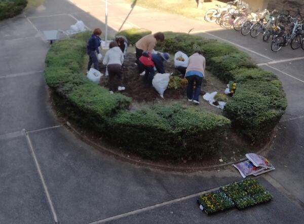本校の正門を入ったすぐのところに、大きな花壇があります。PTAの皆さまが、季節ごとに花を植え替えながら、学校の環境整備にご尽力くださっています。