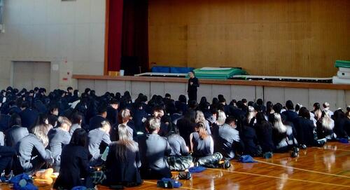 12月9日(火) 試験最終日 2年生は体育館に集合し、修学旅行に向けた全体説明を行いました。