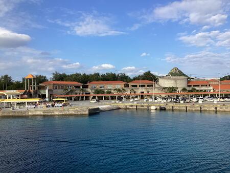 朝が早かったので、みんなお腹が空いて、ペコペコです。トルコライス、沖縄そば、サ-タ-アンダギ-と、沖縄らしい昼食をおいしくいただきました。 昼食後は、いよいよ民泊先の伊江島へ出発です。