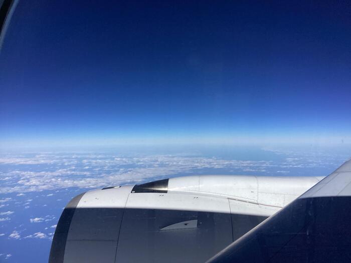 いよいよ出発です 沖縄上空で きれいな海に、ワクワクが止まらない〜
