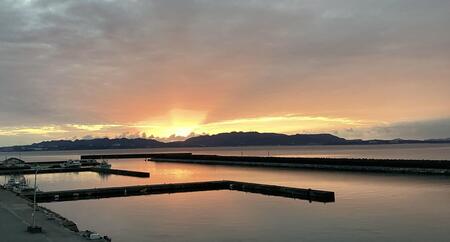 本当に自然豊かな、素敵な島でした。今日の日の出は6時11分...港の展望台からの日の出です。雲がかなり厚かったですが、きれいな朝焼けを見ることができました。