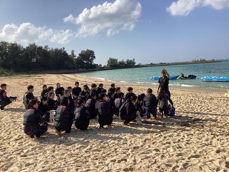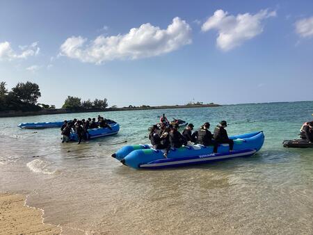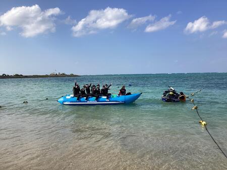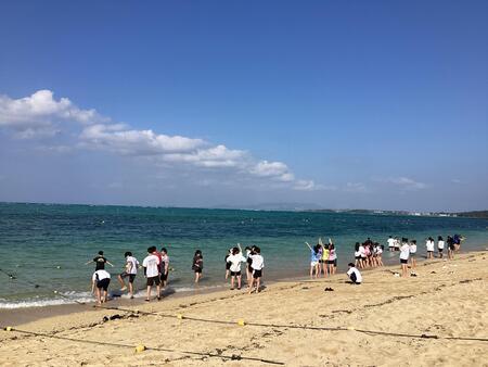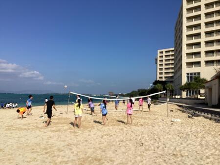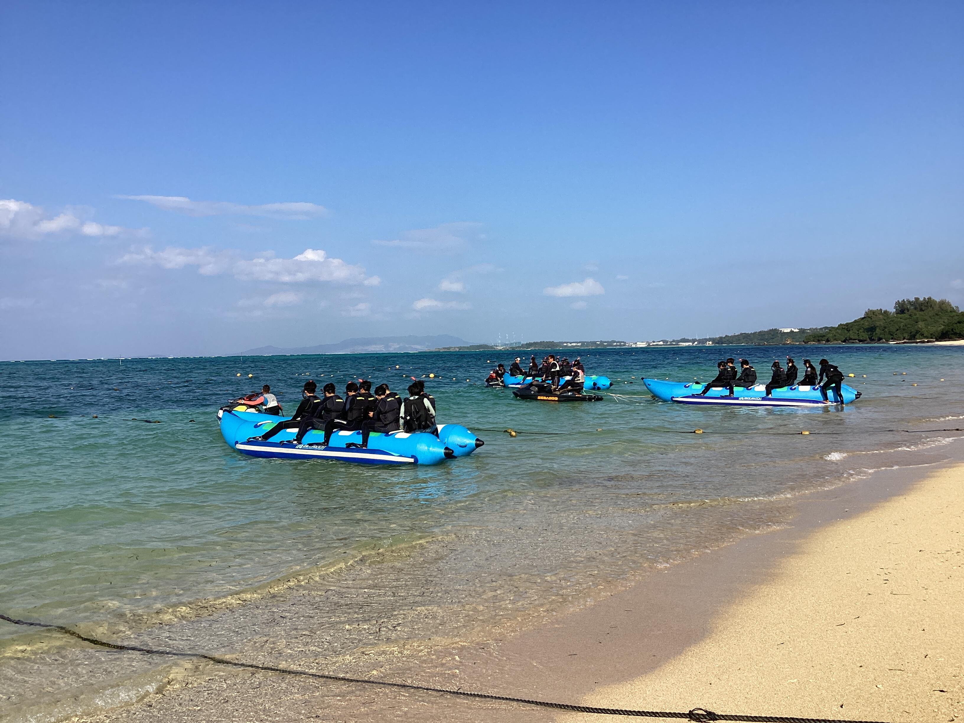 ホテルで昼食をすませたあと、午後は、ホテル前のビーチでマリン体験です。バナナボート、シュノ-ケル、ビ-チバレーにプ-ル。初めての体験もありドキドキです。水は冷たかったけれど沖縄の海を満喫しました。沖縄の海の色は場所によって、時間によって刻々と変化します。その美しさに魅了されますね。