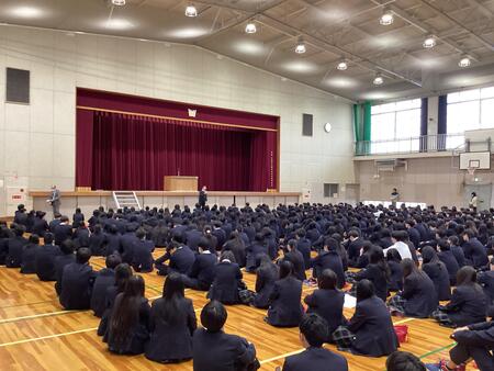 2学期を振り返る話のあと、教務部や生徒指導部からは冬休みの過ごし方についての話があり、充実した休みにしてほしいというメッセージが伝えられました。