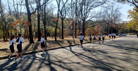 2月4日(水) ロードレースを行いました。朝方は空気が冷たく感じられましたが、競技が始まるころには日差しが差し込み、とても心地よい天候となりました。男子は9キロ、女子は6キロ、大泉緑地の3キロ周回コースを使用しての大会です。