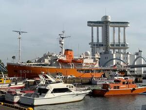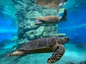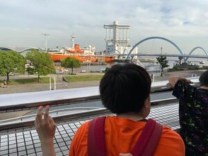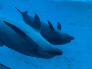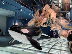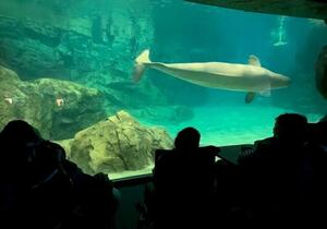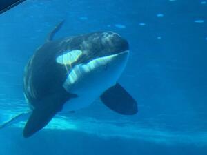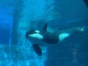 ●13時50分、「名古屋港水族館」到着。入館して、まず目に飛び込んできたのは、大きな大きなシャチ。みんなで集合写真をパチリ!