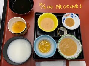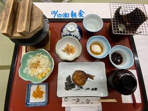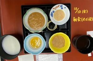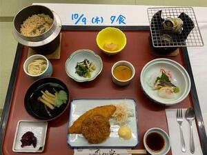 2日目の夕食は、「サザエのつぼ焼き・おつくり・小松菜のおひたし玉地蒸しべっ甲あんかけ・白身フライ・ハムカツ・冷やしうどん・あさりの釜めし・りんごゼリー」。「ハムカツ、おいしい」の話からみんなでワイワイ会話が広がり、笑いが絶えない食事タイムとなりました。