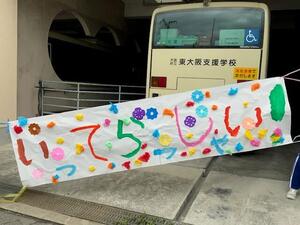 「福祉タクシー」に乗り込むと、たくさんの友だちや先生からの見送り。1年・2年の友だちが自分たちで作った「いってらっしゃい」の旗を持ちながら、「楽しんできてね」「おみやげ話待っています」と手を振りながらエール。3年のみんなは、「わくわくの表情」で「いってきま〜す」。