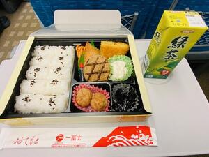 「新幹線、かっこいい」「私、新幹線の窓から富士山を見るのが楽しみ!」「おやつ食べていい?」「早くない?」生徒たちは、おしゃべりを続けながら、楽しく乗車。車内でおいしくお弁当も食べました。お弁当のあとは、楽しみのおやつ。友だちと見せ合いながら「おいしいね」と笑顔。