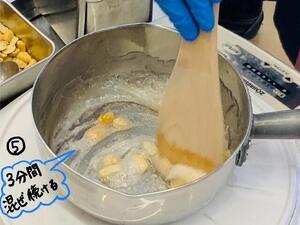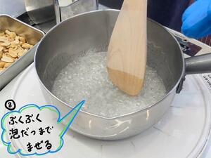 ⑤3分程度、混ぜ続けます。 混ぜると、水飴が白くなってきます。