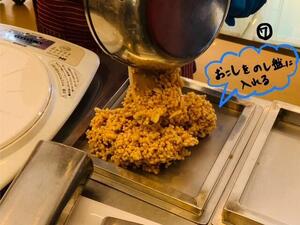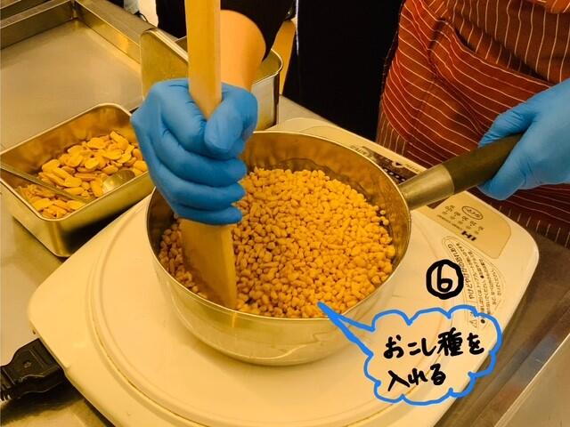⑥煮詰まった「蜜」におこし種を加え、さらに撹拌します。