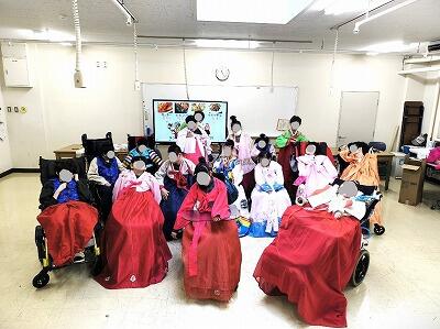 12月9日(火)、A部門高等部で多文化交流がありました。韓国出身の先生が来てくださり、韓国の食べ物や文化について学びました。後半の時間では韓国の衣装のチマチョゴリを着たり、投壺(トゥホ)、という遊びを体験したりしました。普段は着ることのない華やかな服を着たり、楽しい遊びを体験したりして、みんな楽しく韓国の文化を学ぶことができました。