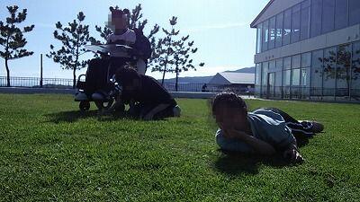 朝食を終え、フェリー乗り場「宮島口港」へ向かいました。出港まで少し時間があったので、芝生広場で身体を伸ばしたり、港散策をしたりして過ごしました。