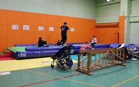 小体育館では大きなエアトランポリンに乗り、先生のジャンプで大きな揺れを体験。びっくりした児童もいましたが、「もっとしてー。」と笑顔で喜んでいる児童もいました。