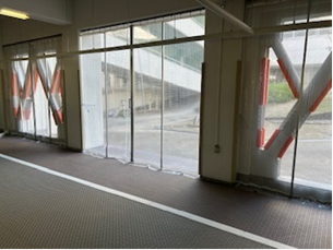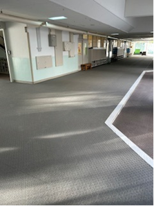今回の工事では、B部門教室棟とスロープ棟の外壁改修が中心でした。壁が全面的に塗り替えられすっかりきれいになりました。また経年劣化で建て付けが悪く開閉しにくくなっていたベランダや廊下の窓も新しくなり、開閉もスムーズになりました。さらに小学部前の廊下も改修されました。一つは廊下がタイル張りでしたが、滑りにくいソフトなシート張りに改修されました。もう一つは同じく小学部前の廊下にアコーデオンカーテンが新設されました。これで雨水や風、落ち葉の侵入を防ぐことができます。