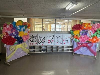 花束は中学部3年生が、「おめでとう」は中学部2年生が作成しました。