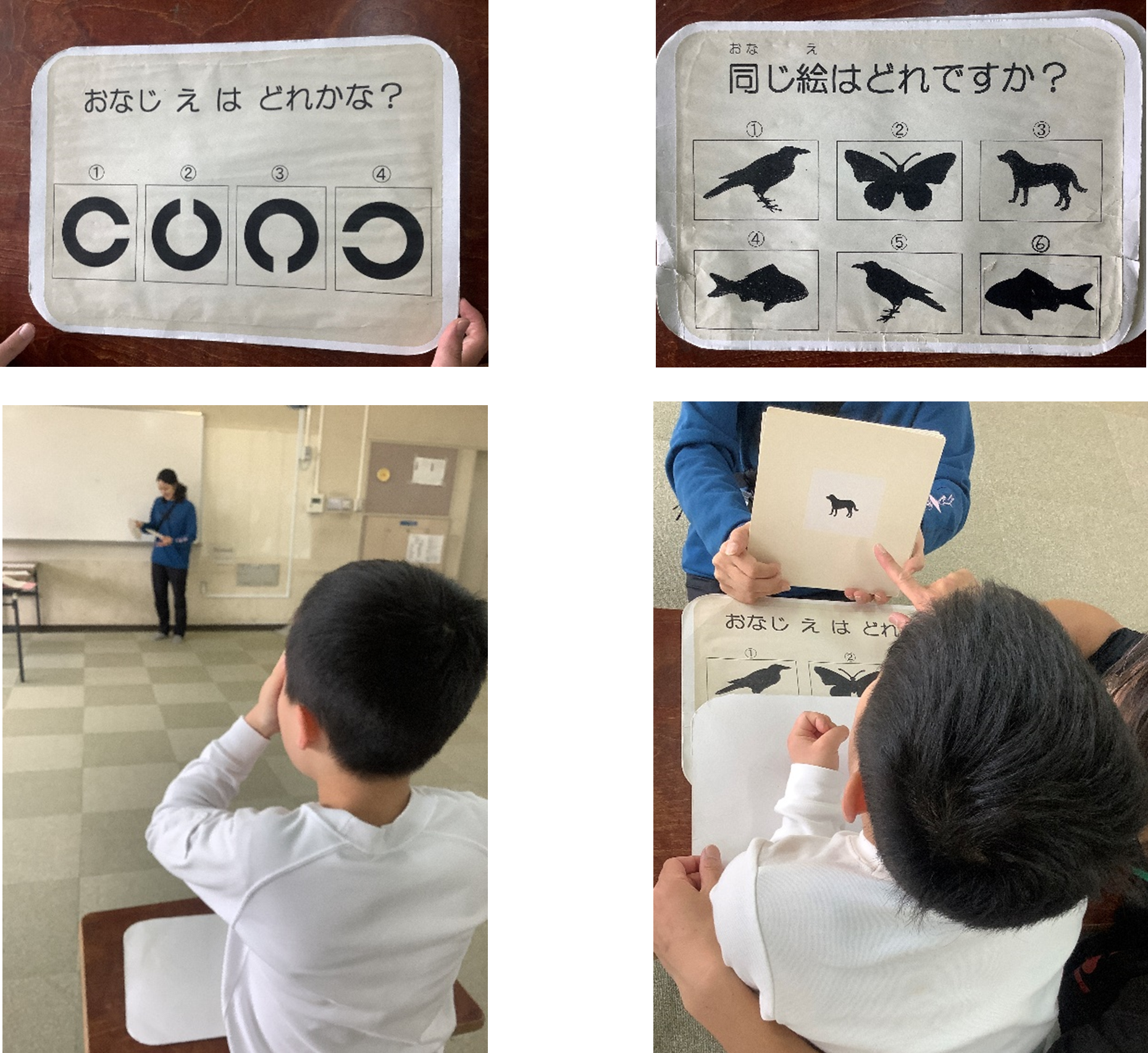視力検査がありました。ランドルト環検査でCの切れ目を答えたり、大きさの違うイラストを見て生き物の名前を答えたりして検査を行いました。