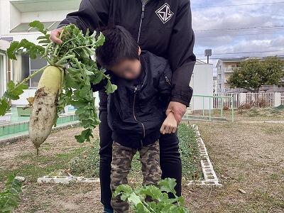 小学部の5・6年生が、生活科の授業で野菜の収穫をしました。 まずは、教室で練習をしました。ながーーーーーーーい大根が抜け、「わたしたちの大根はどうかな?」と期待を胸に畑に向かいました。 「どれにしようかな。」とよく選んでから抜いていました。大きい大根、かわいい人参がたくさんとれましたよ。 種まきをしてから大事に育てた野菜を収穫できて、とてもうれしそうな表情が見られました。