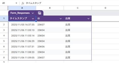自分の専用のコードが、スプレッドシートに出力されると、驚いた表情を見せる生徒もおり、出勤打刻の疑似体験を楽しんで取り組むことができました。