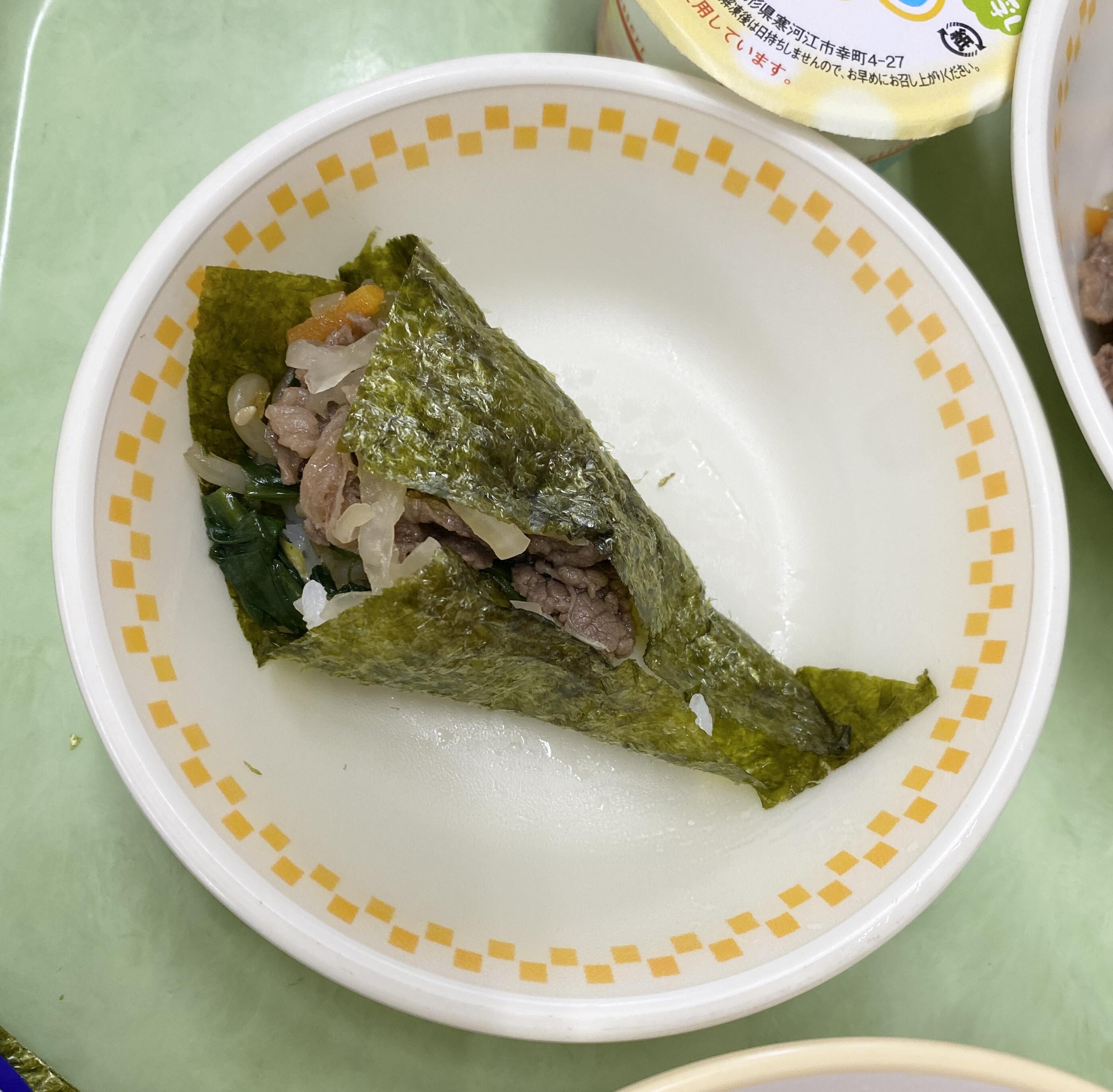 セルフキンパ(牛肉・ナムル・沢庵) トックスープ ※だんかいしょく とうふのスープ とうにゅうプリン ★B部門高等部1年生が考えたアイデアいっぱいの献立★ ~セルフキンパ、トックスープ~ 家庭科の授業で、5大栄養素について学習した後、栄養バランス・彩り・オリジナリティを意識して、「オリジナル給食」を考えました。 たくさん考えてくれた中から、セルフキンパ・トックスープ・デザートの献立が選ばれました。 セルフで食べるキンパです。海苔にごはんをひろげ、甘辛く炒めた牛肉とナムル、沢庵をのせて巻いて食べます。 |