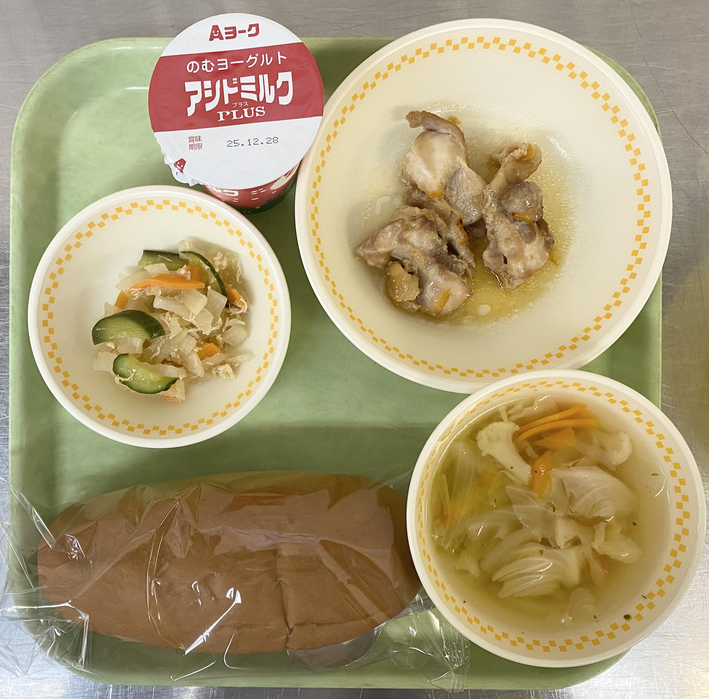コッペパン いちごジャム タンドリーチキン ブロッコリーとキャベツのサラダ はくさいのスープ |