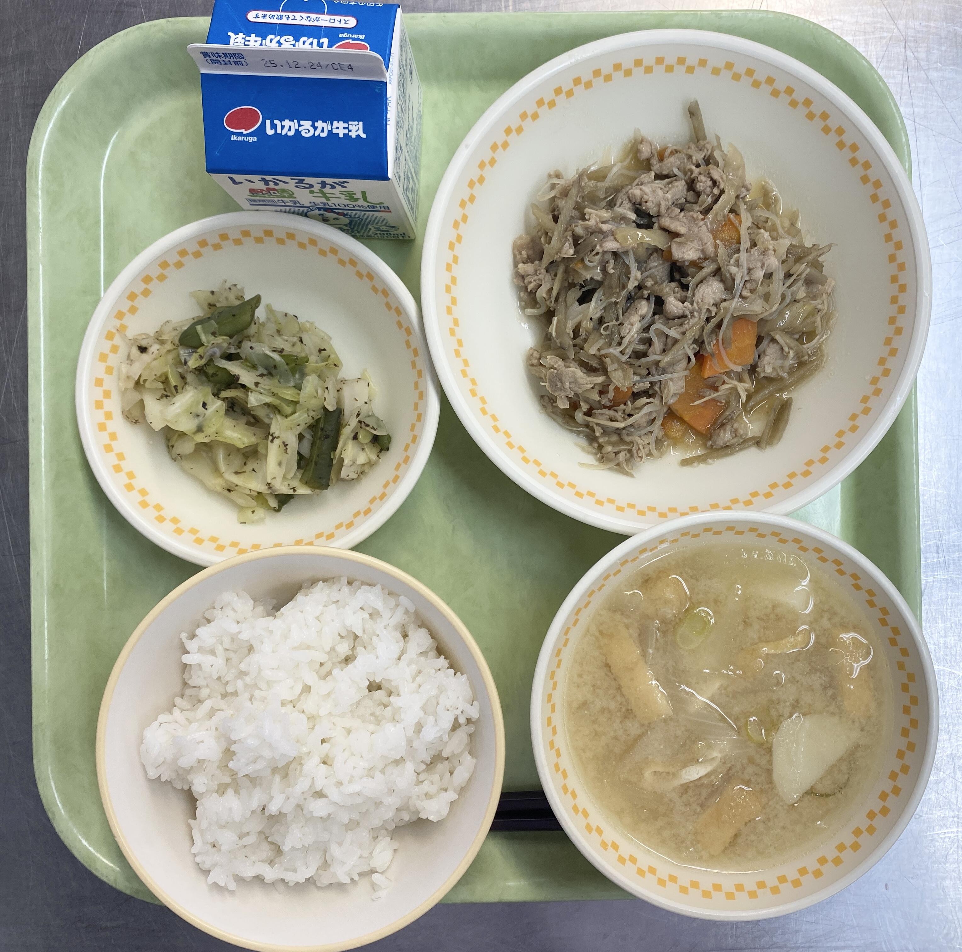 ごはん ぶたにくとごぼうのいために キャベツのゆかりあえ じゃがいもとたまねぎのみそしる |