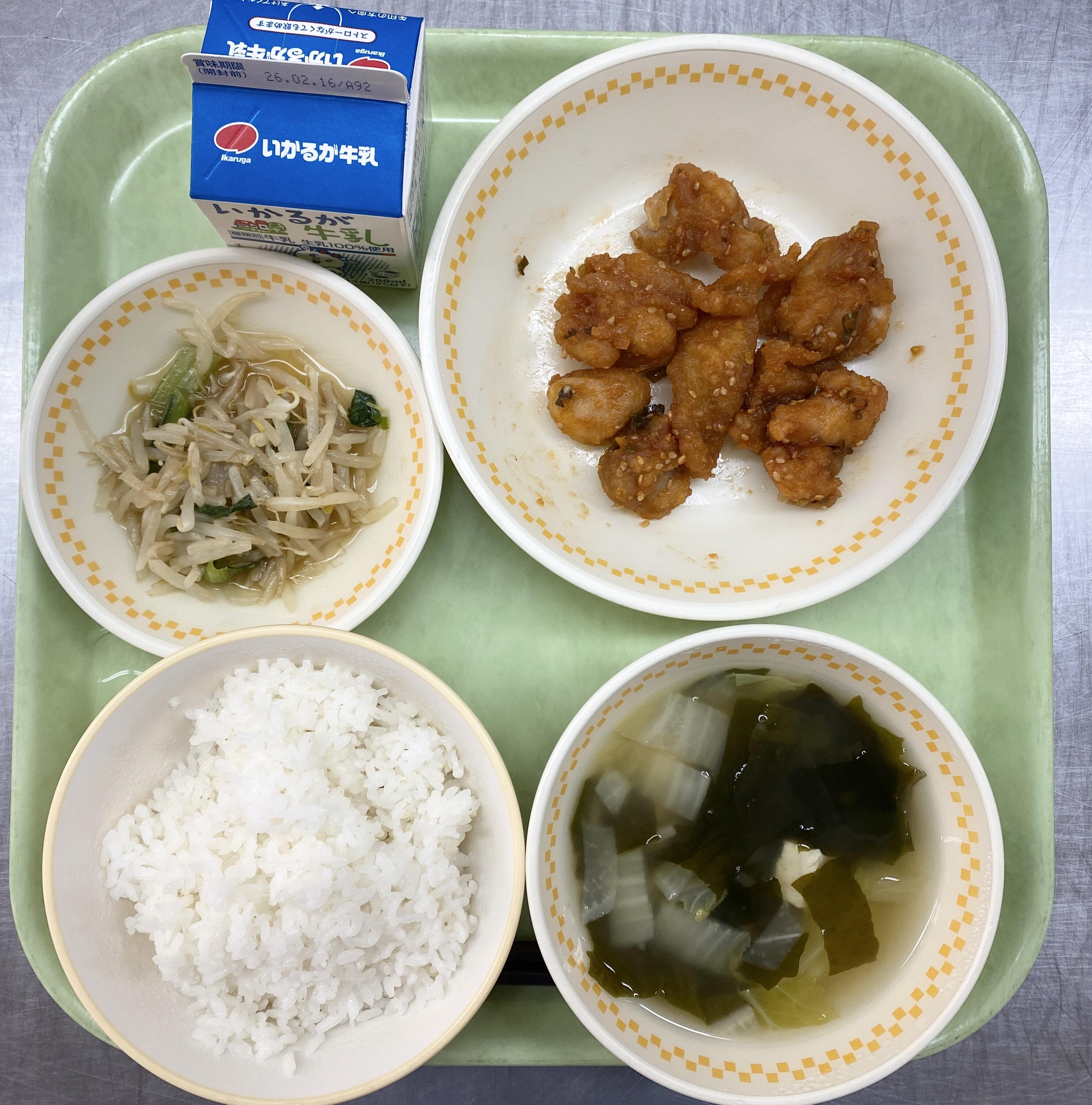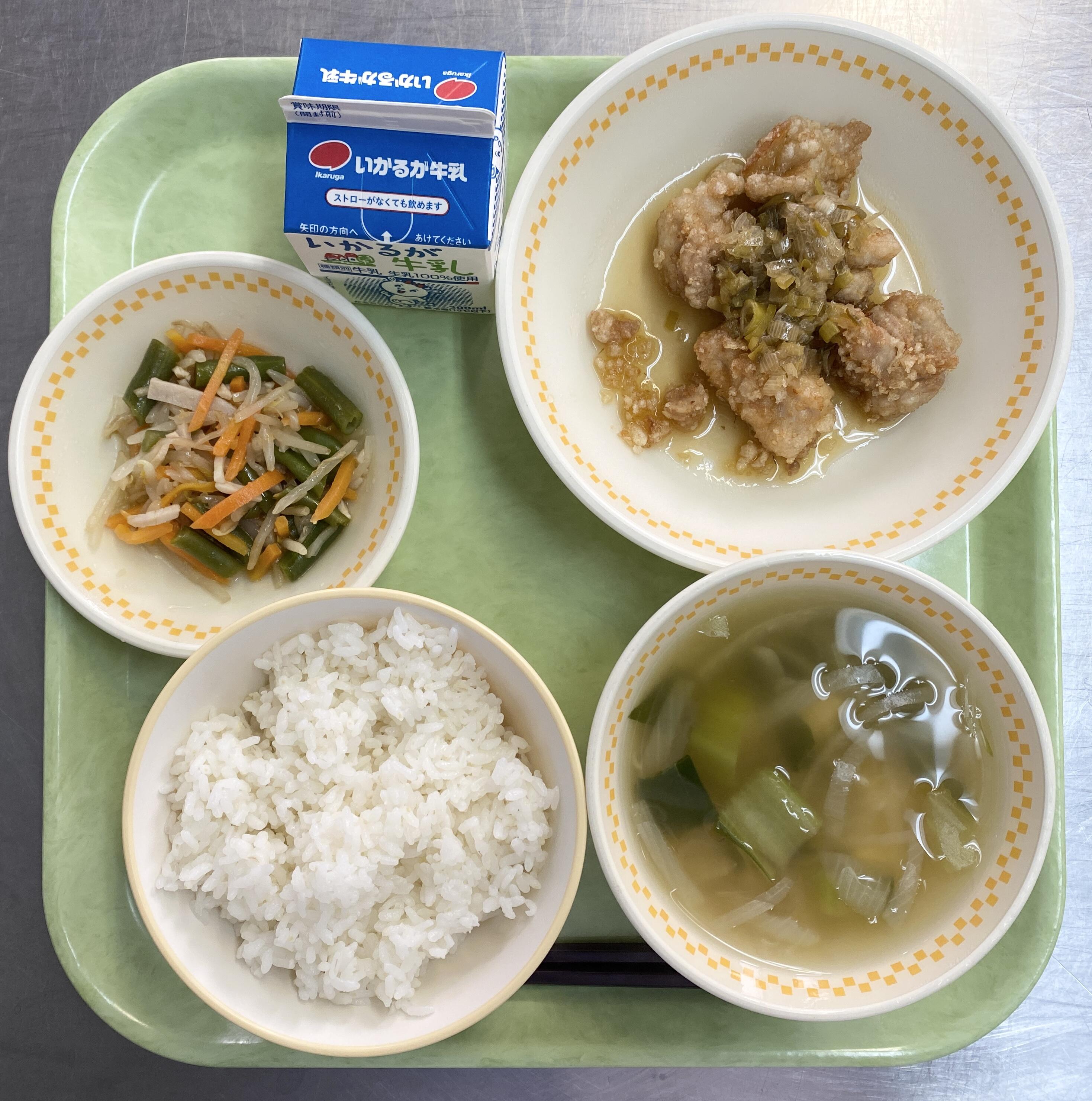 ごはん ユーリンチー もやしとさんどまめのちゅうかあえ チンゲンサイのちゅうかスープ |